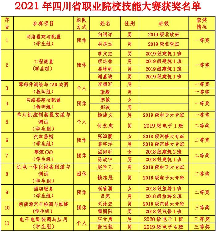 2021年四川省职业院校技能大赛于2021年4月19日至28日举行,我校选手参加了11个项目的比赛,荣获一等奖6个,二等奖5个,三等奖3个,创历史最好水平。