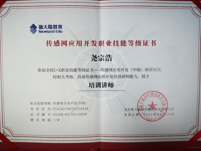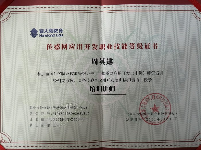 2021年4月,全国1+X职业技能等级考试传感网应用开发师资培(中级班)在四川交通职业技术学院举办,成都石化工业学校电子技术应用专业尧宗浩、罗国峰、周英建三位老师参加本次培训,并顺利取得1+X传感网应用开发职业技能等级证书中级培训讲师资格。