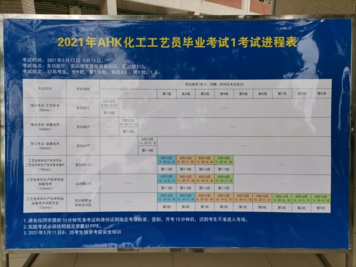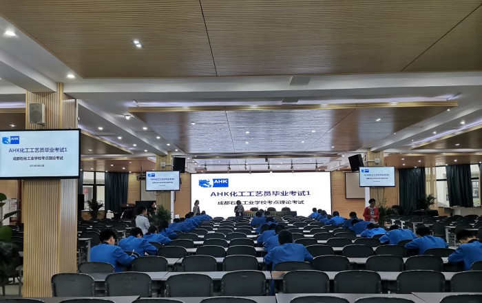 5月12日上午,在北校区多功能厅进行了《工艺技术》《测量技术》《设备技术》理论考试,AHK化工类专业考官、AHK工作人员一行三人亲临现场督考。
