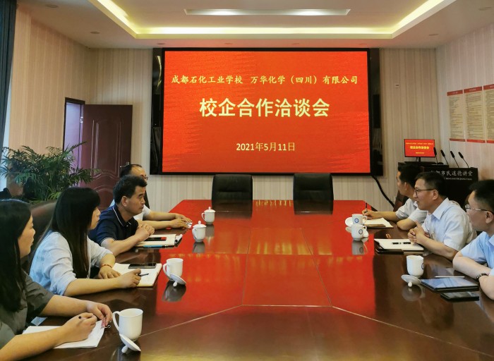 5月11日上午,万华化学(四川)有限公司副总经理薛峰、综合办副主任燕彬、人力资源副主任张立军一行到成都石化工业学校洽谈合作事宜,学校副校长刘遵勇、招生就业处、化工科相关负责同志热情接待了来宾。