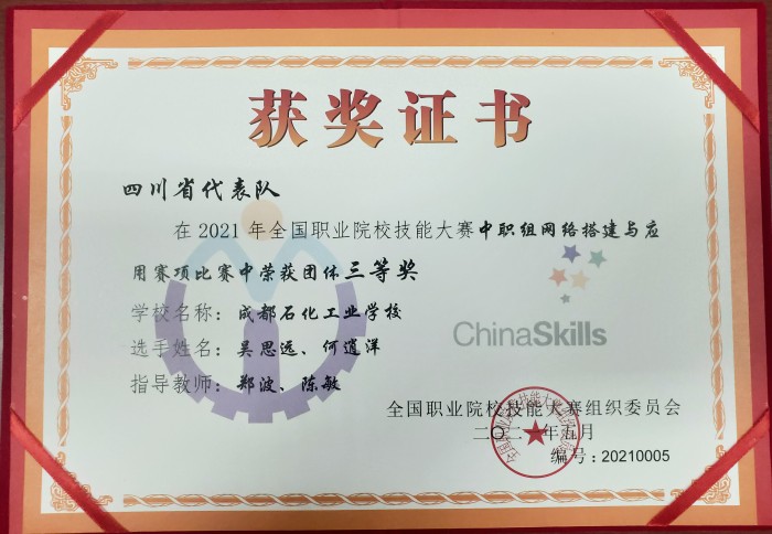 2021年5月20-21日,全国职业院校技能大赛中职组网络搭建与应用赛项在山东济南举行。成都石化工业学校计算机应用专业首次代表四川省参加此项比赛,喜获三等奖!实现了彭州职教在国家级技能大赛中新参加赛项新的突破。