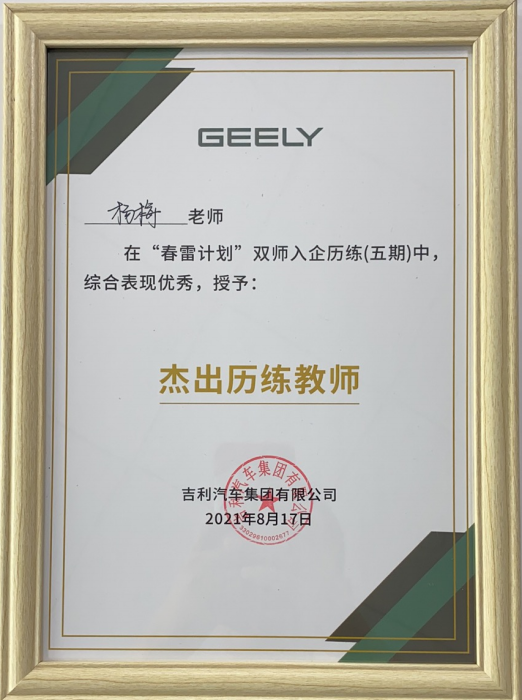 同时杨老师进入吉利汽车大江东生产基地焊装车间开启了为期20天的历练。历练期间,她严格执行公司的相关规定,深入生产一线,积极主动与企业大师和车间工人进行交流学习,提升对企业文化和管理、新技术、新工艺、新设备的认知和了解。培训结束后,杨老师被评为“杰出历练教师”,她表示将不断提升自己的专业技能及教学水平,逐步积累和更新自身知识,将企业成果转化到教学中去,努力培养更多企业需要的高素质技术技能人才和能工巧匠。