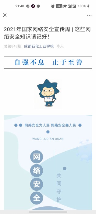 为进一步发挥校园宣传教育主阵地作用,维护国家网络安全,10月11日起,成都石化工业学校围绕“网络安全为人民,网络安全靠人民”的主题,开展了网络安全宣传教育系列活动。
