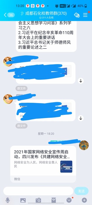一、加强阵地宣传,营造浓厚氛围。学校专门成立以校长为组长,副校长为副组长,分管副校长为工作小组组长,办公室、政教处、学前信息科为成员的国家网络安全周工作领导小组及工作小组,扎实开展网络安全宣传教育活动。校长周川益在教师会上强调,全体师生家长都必须学习了解网络安全知识。学校利用校园微信公众号、校园数字平台、班级(家长)微信群、班级(家长)QQ群、室外LED宣传图片等方式开展网络安全宣传活动,营造浓厚的维护网络安全氛围。