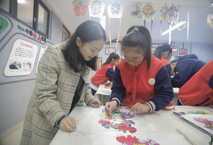 彭州市敖平雅居乐小学王钰怡老师以学校创编的舞蹈《风筝飞进西瓜田》为引,与孩子们一起聊起了风筝的起源、种类、制作方法,并带着参会老师和孩子们一起动手制作风筝,从构图、着色、粘贴和穿线等多方面让学生感受着非遗文化的艺术魅力,伴随着放飞蓝天风筝的绚丽色彩,孩子们也体验着劳动创造幸福的美好。