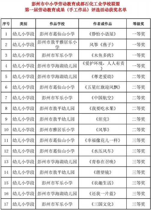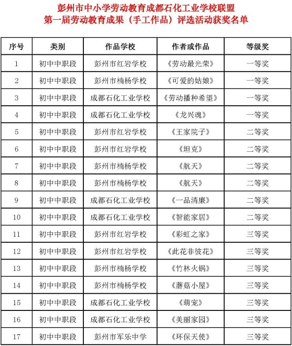 研讨活动中,联盟开展了第一届劳动教育成果(手工作品)现场评比,9个联盟学校涵盖中职、中学、小学、幼儿园,分为幼儿小学段、中学中职两个组别评选,共评选出一等奖8个,二等奖12个,三等奖15个,优秀奖5个。