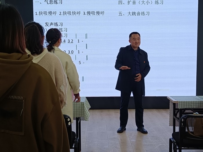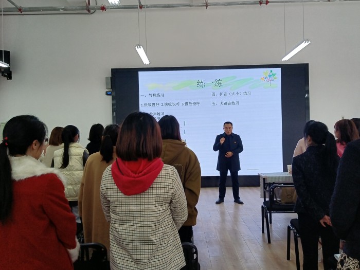 培训从气息练习、发声练习、长音练习、扩音练习、大跳因练习、歌曲演唱技巧练习等方面进行了讲解、练习。培训中杨志强老师以“现场示范、跟唱指导、难点解析”的方式为老师们清晰地呈现了歌曲演唱的方法,针对老师中存在的演唱问题进行指导。