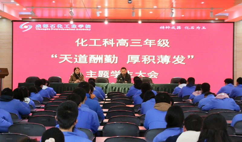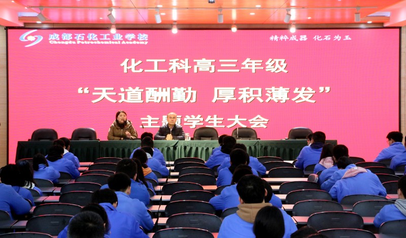 为了激励高三学生迎战2022年升学考试,3月1日,成都石化工业学校化工科在北校区多功能厅召开了主题为“天道酬勤,厚积薄发”高三年级学生大会。化工科相关负责同志及2019级全体学生参加了会议。