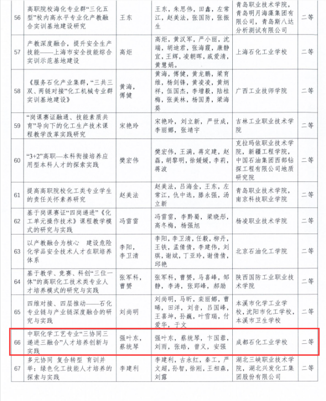 近日,中国化工教育协会公布了第六届中国石油和化工教育教学成果认定结果,成都石化工业学校《中职化学工艺专业“三协同三递进三融合”人才培养创新与实践》喜获中国石油和化工教育教学优秀成果(职教)二等奖。