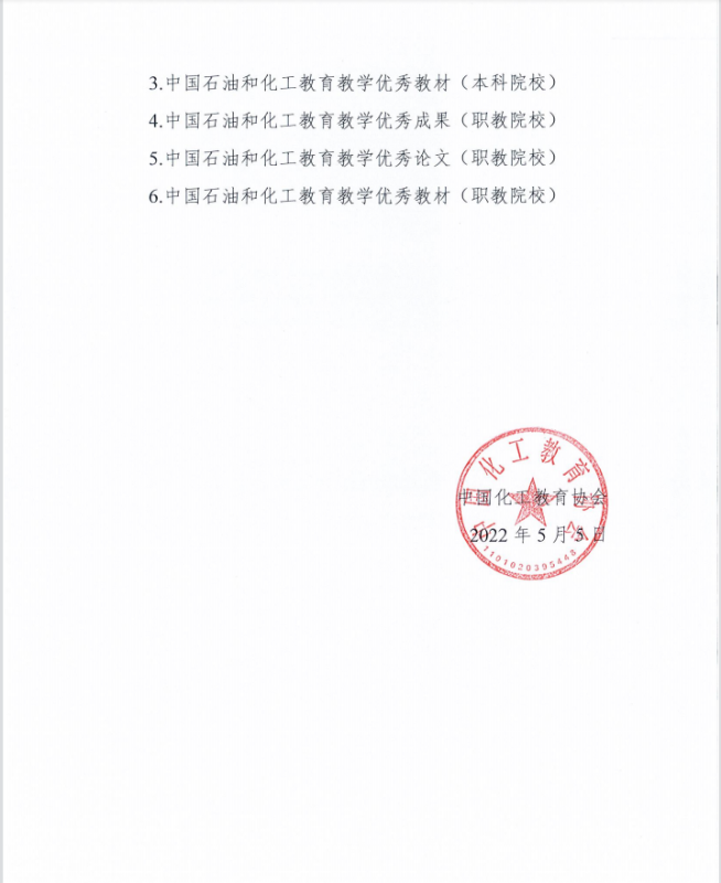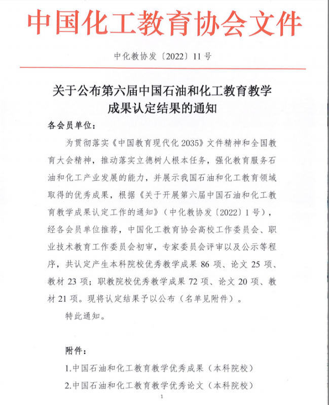 本次成果认定是中国化工教育协会为贯彻落实《中国教育现代化2035》文件精神和全国教育大会精神,推动落实立德树人根本任务,强化教育服务石油和化工产业发展的能力,并展示我国石油和化工教育领域取得的优秀成果而开展的全行业教育教学成果认定,参与单位囊括了本科院校、职业院校。经各有关单位推荐,中国化工教育协会高校工作委员会、职业技术教育工作委员会初审,专家委员会评审以及公示等程序,共认定优秀职教教学成果72项、论文20篇、教材21项。