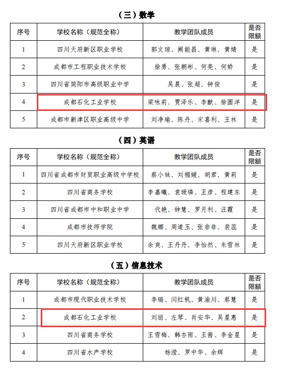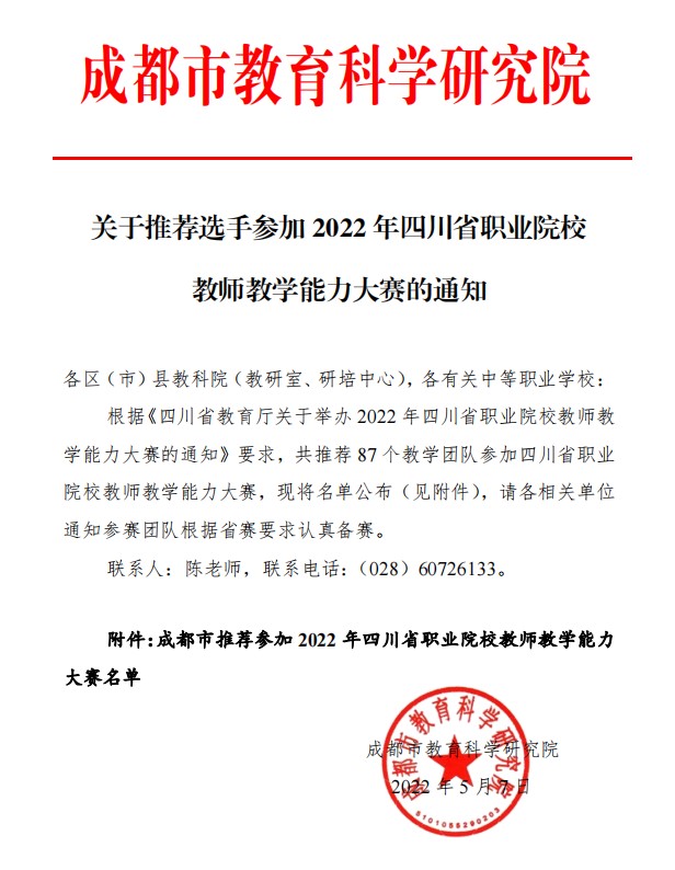日前,成都市推荐参加2022年四川省职业院校教师教学能力大赛名单出炉,成都石化工业学校数学、计算机、汽修专业三件作品入围,实现了学校教师参加该赛事的新突破。本次大赛由四川省教育厅主办,重点考察教学团队(2-4 人)针对某门课程部分教学内容完成教学设计、实施课堂教学、达成评价目标、进行反思改进的能力。成都石化工业学校参赛队伍历经市赛选拔、资格审核、网络初评、决赛等环节,竞争激烈,精彩纷呈,全面展现了新时代职业教育的改革成果与教师风采。
