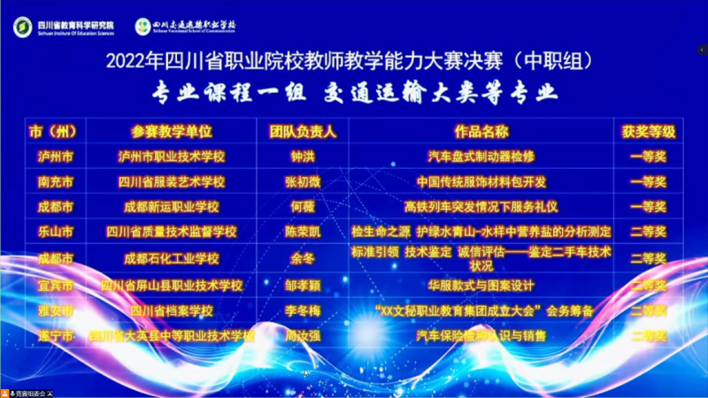据了解,该教学比赛团队自2021年组建以来,坚持中青结合,优势互补,强化责任担当。团队依据大赛文件要求,遵循学校最新人才培养方案和课程标准要求,扎实推进参赛课程的落地实施,以“三教”改革为抓手,将思政元素融入专业课程,建立了“岗、课、赛、证”四位一体的教学模式,并多次邀请信息化类和汽车专业类专家对相关材料进行研讨。团队负责人从录课场地环境设置、实训器材设备准备和外出学习培训等方面积极与学校相关部门沟通配合,在经历了4月的成都市初赛,5月的成都市决赛和四川省初赛选拔后,最终踏进7月的四川省决赛。尽管该教学团队在备赛省决赛期间遇到一些困难,但全体成员不等不靠,凭借集体的力量将困难一一克服,他们用自己的行动生动诠释了“精粹成品?化石为玉”的校训。
