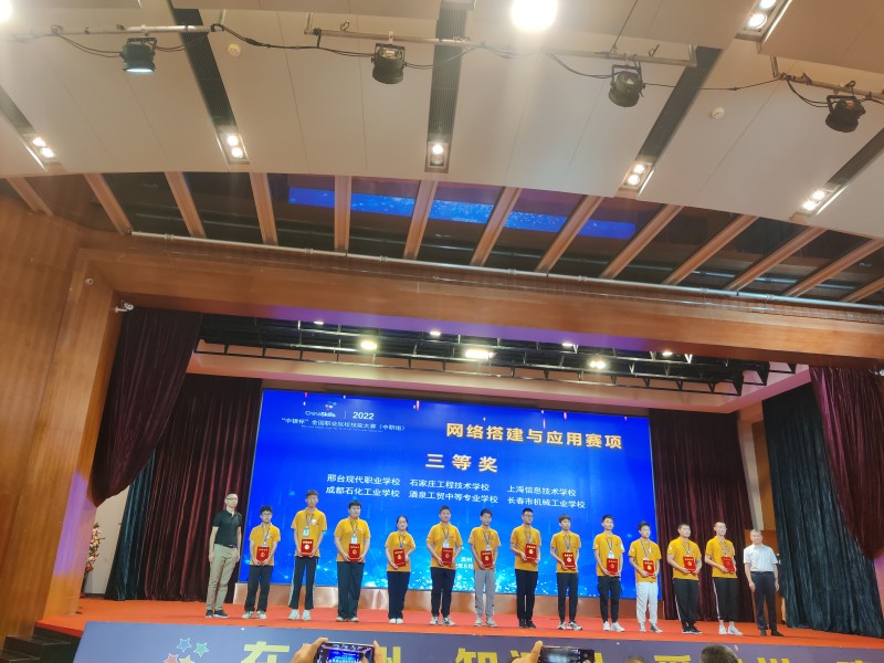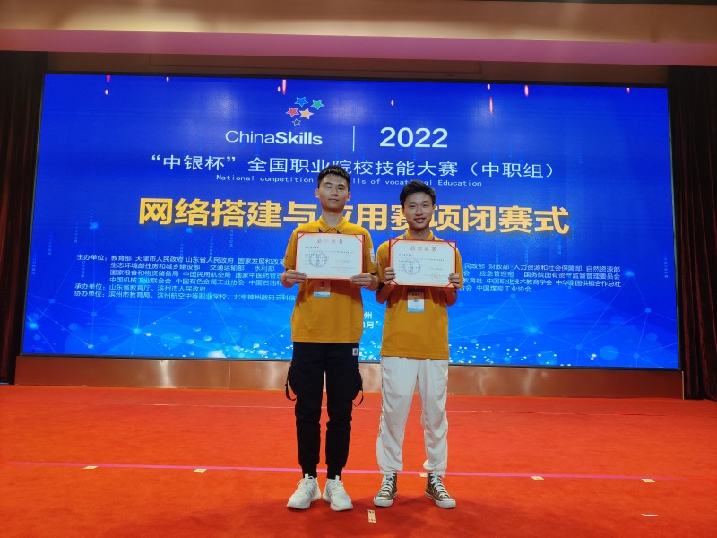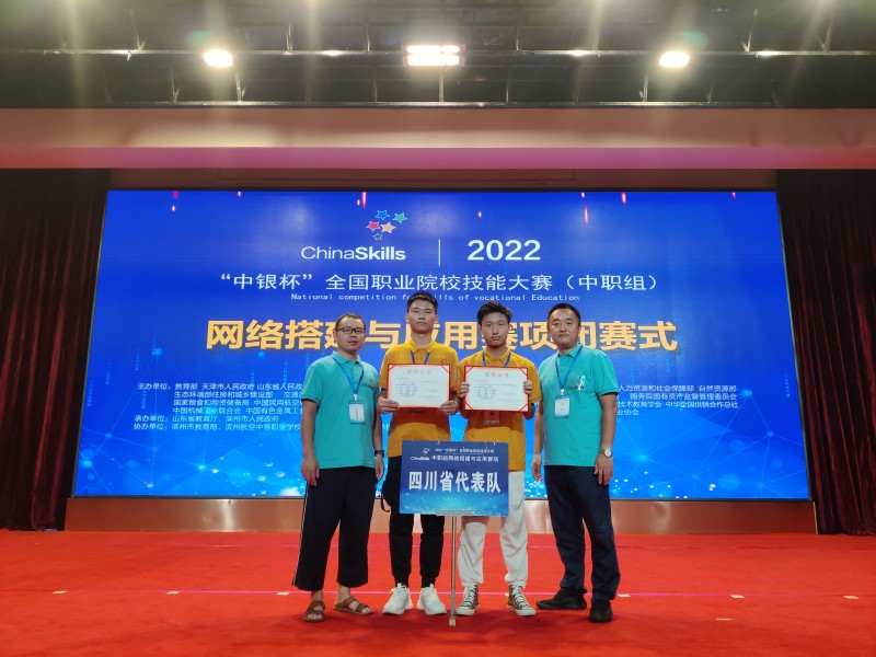 2022年8月22-24日,全国职业院校技能大赛(中职组)网络搭建与应用赛项在山东省滨州市举行,成都石化工业学校李泽天、文一帆两位选手,代表四川省出战,与来自全国不同省份的65支代表队同台竞技。在强手如云、竞争激烈的国赛场上,李泽天、文一帆沉着应战,稳定发挥,突出重围,获得三等奖,实现了学校在该项赛事中的连续获奖。
