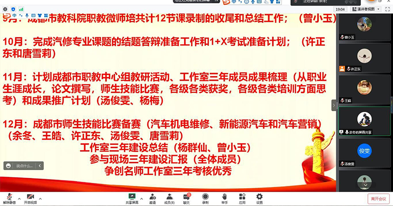 最后名师工作室领衔人余冬老师对工作室本期的计划进行了介绍,今年继续完成成都市教科院下达的微师培项目,并完成汽修专业课题的结题答辩和第四批校内“1+X”考试准备工作,同时从职业生涯成长、论文撰写、师生技能大赛等方面对工作室三年成员成果梳理并将成果进行推广,继续组织师生参加成都市技能比赛,并争取在工作室第三年考核中获得优秀等级。