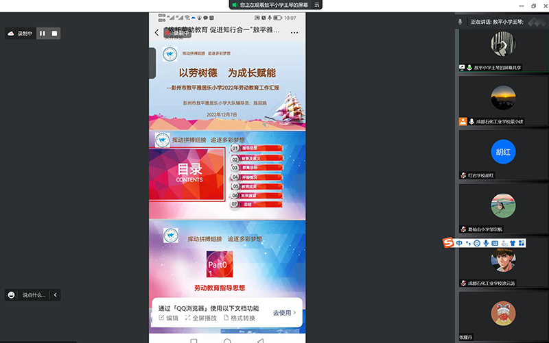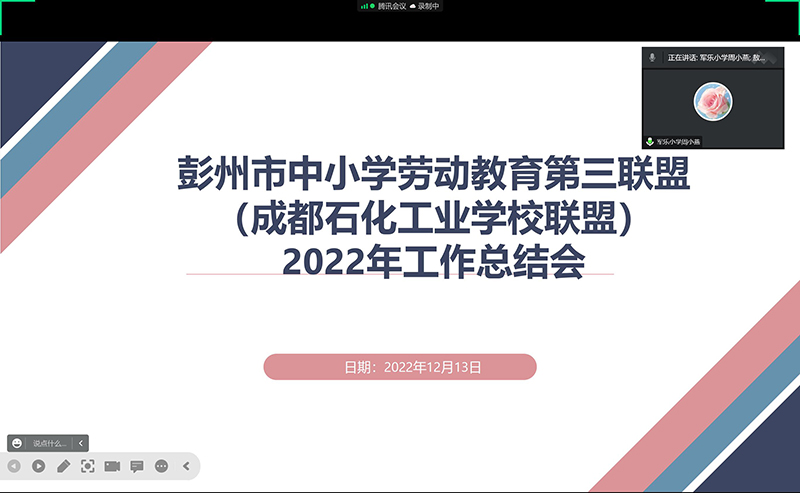 为深入贯彻落实习近平总书记关于教育的重要论述,全面贯彻党的教育方针,落实立德树人根本任务,把劳动教育纳入人才培养全过程,培养德智体美劳全面发展的社会主义建设者和接班人,进一步推进《义务教育劳动课程标准(2022 年版)》落地落实,引领各学校规范开设劳动教育课程及劳动育人实践,12月13日上午,彭州市中小学劳动教育第三联盟(成都石化工业学校)采用腾讯会议形式举行年度工作总结会。