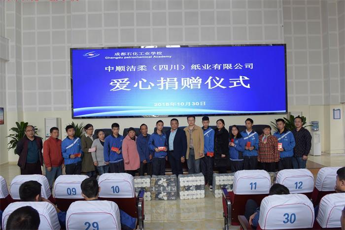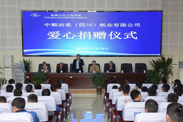 10月30日上午9点,成都石化工业学校南校区109会议室掌声阵阵——“中顺洁柔(四川)纸业有限公司爱心捐赠仪式”在此举行,中顺洁柔(四川)纸业有限公司制造部刘总经理、人力资源部张经理、工会杨主席,成都石化工业学校副校长周川益、教务副主任刘光林及学校两百余名师生参加了活动。