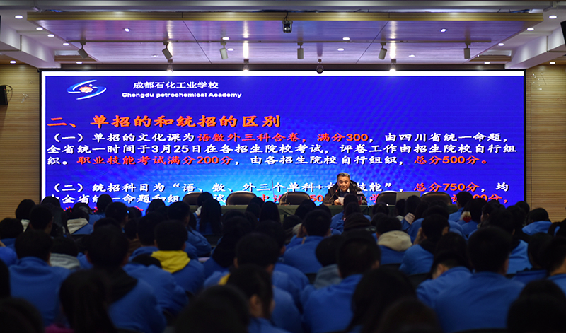 为确保学生能够通过单招考上自己心仪的高职院校,2月21日,成都石化工业学校南北校区同步召开了2020级学生单招培训会。