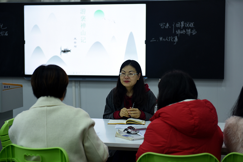 本次活动在罗琼老师的精彩授课中展开,罗老师以《游褒禅山记》的课文结构及写法为重点,采用以读促写的方式,为大家展示了一堂完整的“学以致用”教学课。授课结束后,首先由罗老师分享本节课整体设计思路,以及重难点的确定和化解方法。然后南北校区语文组的老师们纷纷就罗老师的教学设计及实施过程发表自己的听课点评。紧接着,陈莉老师及肖安华老师就语文课题设计及课程建设与老师们进行深入交流,重点提醒老师们关注课前学情的分析、课程目标的落实、教学设计格式规范性以及在教学过程中对信息化资源的取舍与运用。