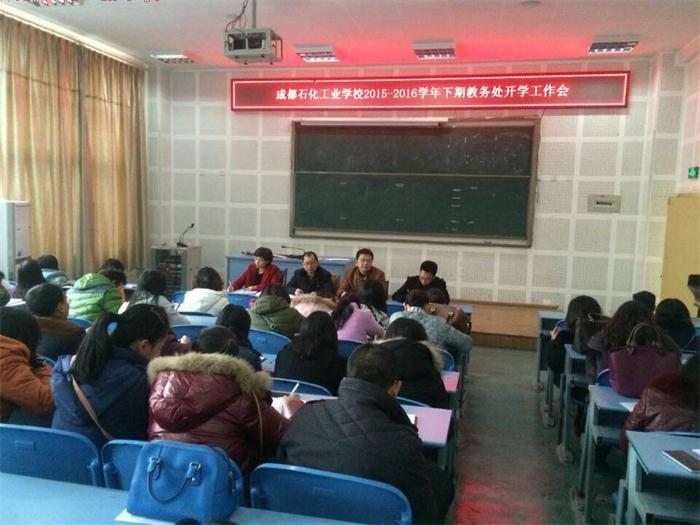 2月21日下午,成都石化工业学校教务处召开了2015——2016学年下期教务处开学工作会议。分管教学的周川益、徐小林、罗冬梅、马洪敏出席会议。学校教务处、专业科教学副科长、干事、资助办、查课室、实作室管理人员参加会议。