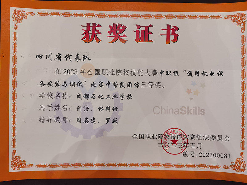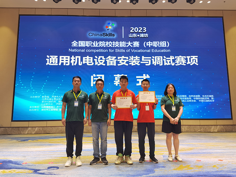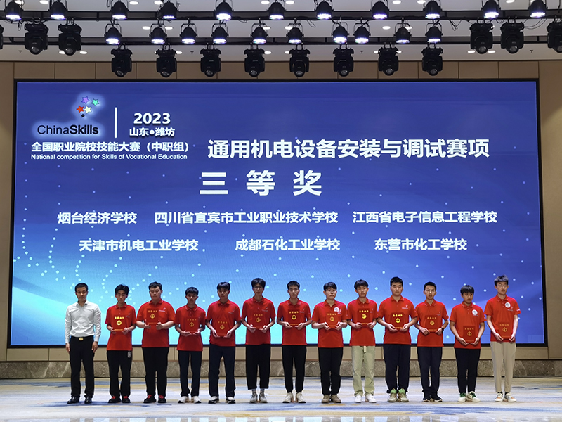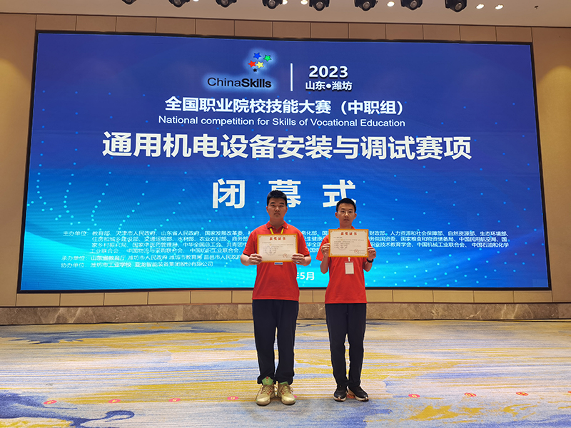 2023年5月14日教育部在山东潍坊举行了“2023年全国职业教育活动周”的启动仪式,5月15日我校电子专业学生刘浩、林新皓(指导教师:周英建、罗威)代表四川省首次在潍坊市工业学校承办的“通用机电设备安装与调试”赛项(中职组)比赛中,与全国82支代表队展开同台竞技,荣获三等奖!