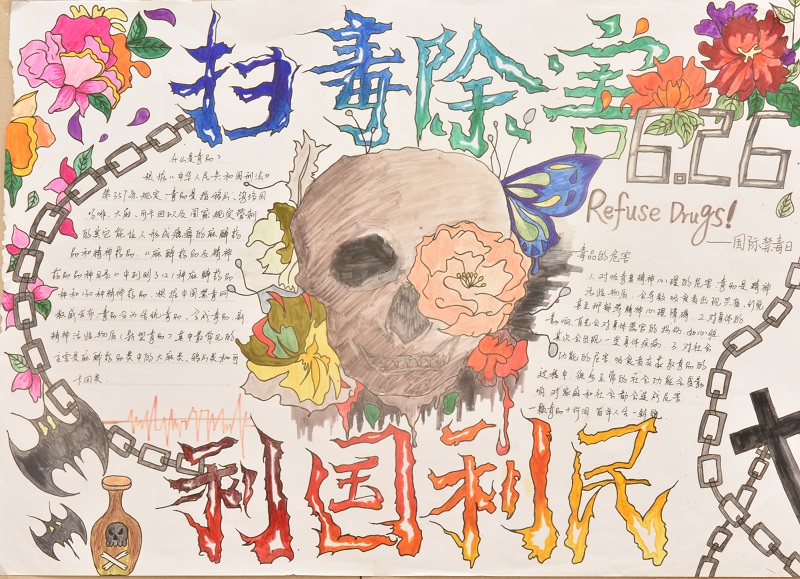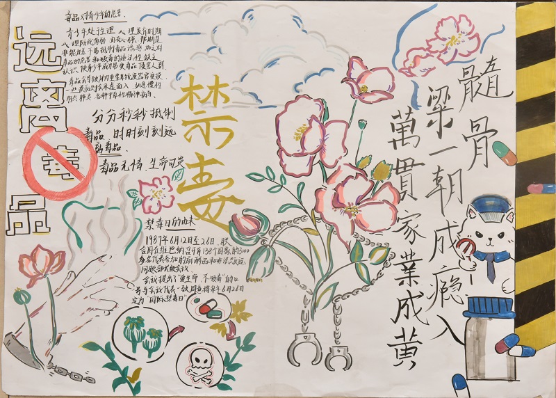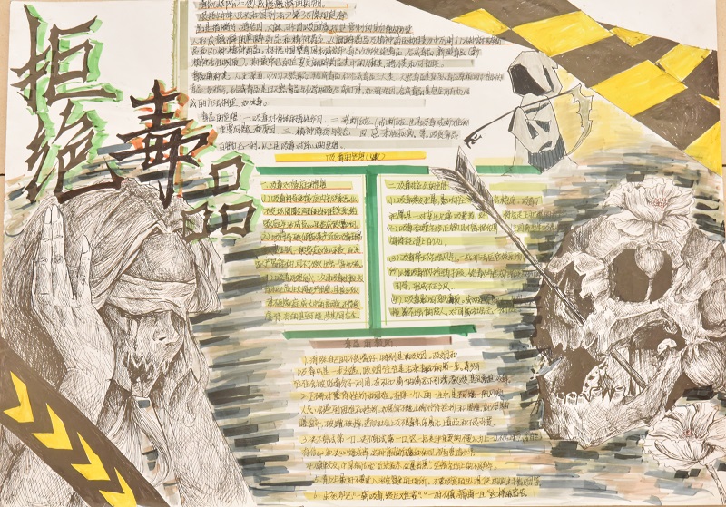 一幅幅设计精美的禁毒手抄报,主题鲜明、形式多样、内容丰富,独具匠心。充分展现了毒品对个人、家庭、社会的危害以及防毒、拒毒方法等,“骷髅头”“铁链子”“鲜血”“罂粟花”……这些接近死亡、失去自由、重口味的图片形象生动、寓意深刻地出现在同学们的禁毒手抄报中,反映出学生对毒品危害的深刻认识,抵制毒品的坚定决心及对绿色无毒生活的美好憧憬。