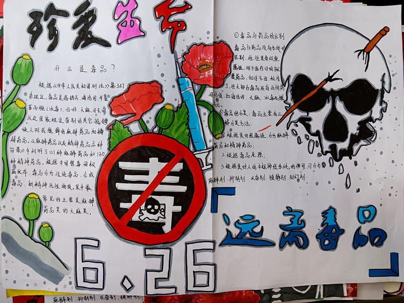 此次禁毒手抄报评比活动,提升了学生创造现实美和艺术美的才能,真正让珍爱生命、远离毒品的观念深入每一个学生的心中,为建设平安校园、和谐校园奠定了坚实的基础。