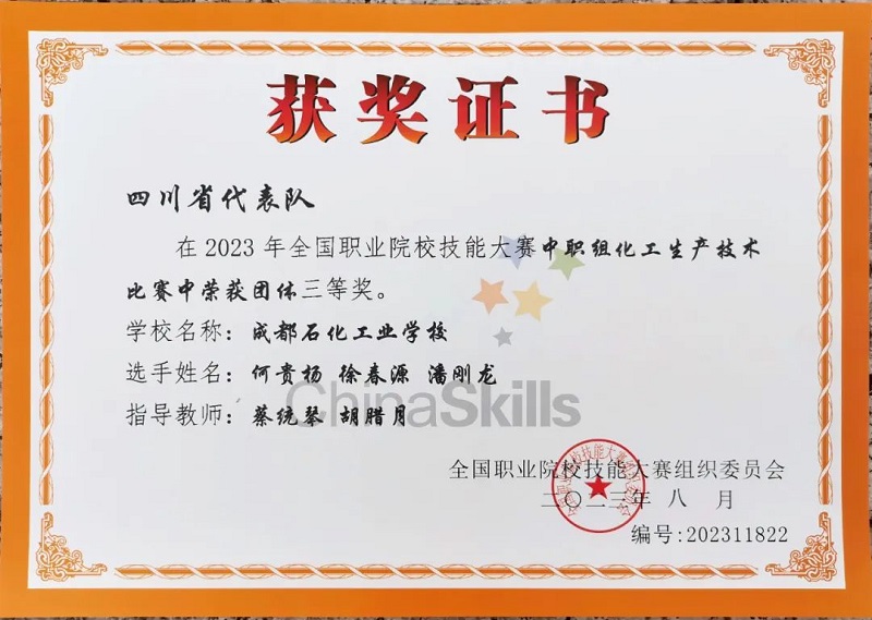 经过三天半紧张、激烈的角逐,成都石化工业学校化学工艺专业学生何贵杨、徐春源、潘刚龙克服重重困难,在参加2023年全国职业院校技能大赛(中职组)化工生产技术赛项的48支队伍中脱颖而出,成功进入前18强,荣获三等奖。