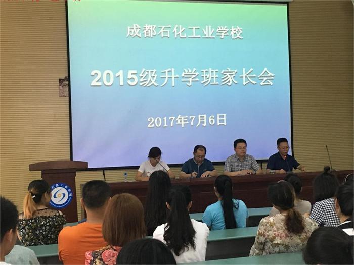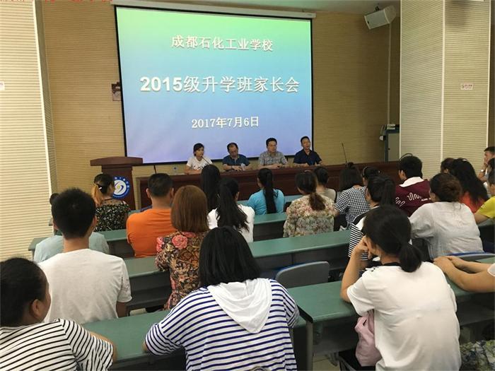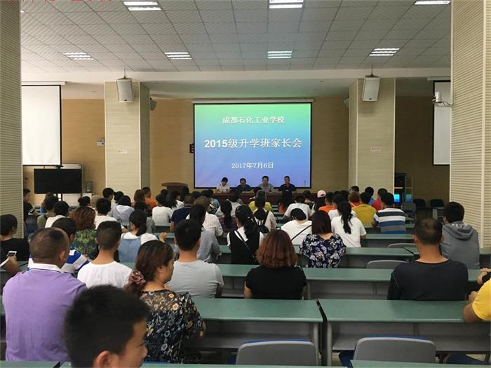 2017年7月6日星期四,雨后的成都石化工业学校蓝天白云、风高气爽,来自2015级六个升学班的54名学子及其家长共计130余人齐聚南校区多功能厅,参加成都石化工业学校2015级升学班学生、家长会,周川益副校长、教务处徐小林主任、马洪敏、罗冬梅两位副主任及2015级升学班班主任参加了此次会议。