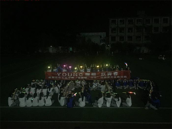 ? ?为了激励青年学生“走下网络、走出宿舍、走向操场”,5月21日晚,由校团委、住校生管理办公室共同主办的“奔跑吧,少年”校园荧光夜跑活动在成都石化工业学校北校区集会广场绚丽在学启幕。