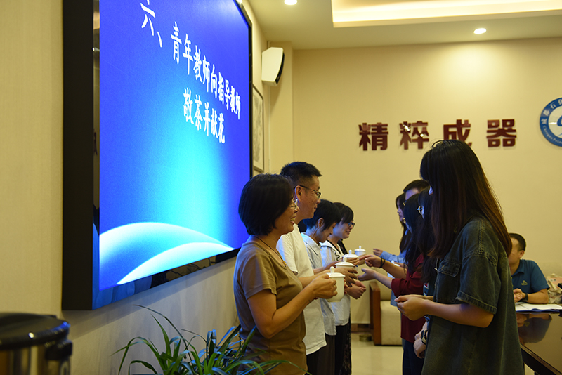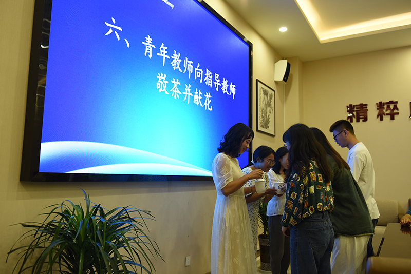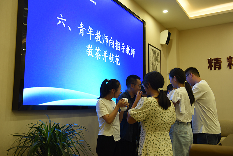 接着,罗冬梅宣读师徒结对名单和确认双方职责,并请师徒双方在《师徒结对协议书》上签字。周川益和张昌波为本次结对中的所有师父们颁发了聘书,并合影留念。随着师父们捧起那一张张既“轻”又“重”的聘书,本年度师徒结对活动也正式拉开了庄严的序幕——拜师仪式,徒弟们分别向自己的师父敬茶并献花。刘银老师和陈可欣老师分别作为师父代表和徒弟代表发言,表示将不负学校嘱托,将提升自己的教育教学水平、教科研能力和班级管理水平为目标。