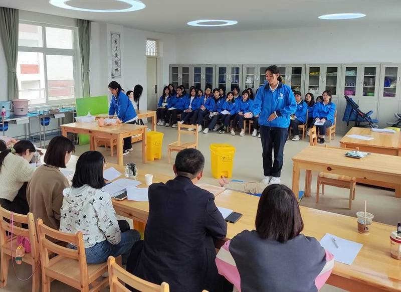 8日下午,成都石化工业学校学前信息科幼儿保育专业学生向彭州市妇幼保健院托育园罗老师、姚老师展示了婴儿沐浴、烫伤的应急处置、外伤出血的应急处置、高热惊厥应急处置等技能。罗老师、姚老师对学生的操作进行了专业的点评和指导。