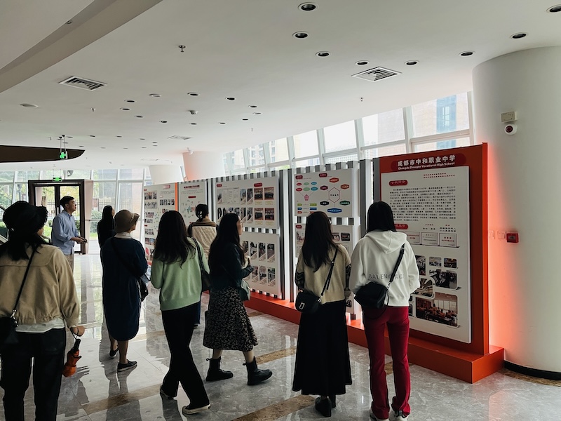 在成都市中和职业中学旅游管理系主任杨娟及旅游与酒店管理专业主任李宇飞的带领下,成都石化工业学校综合科旅游专业教师们先后参观了该校的创新创业商业街、党建教育展示区、图书馆、艺术中心,校企合作酒店、旅游实训室。