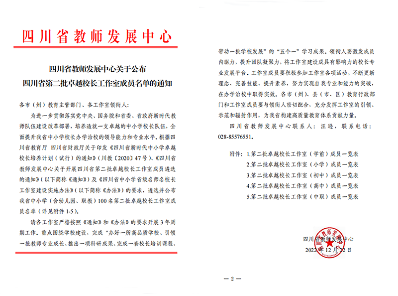 在启动仪式现场,彭州市教育局学前与终身教育科科长孙伟宣读了四川省教师发展中心关于四川省第二批卓越校长工作室成立文件及成员名单,并向领衔人授牌。孙科长在讲话中提出三点期待,希望周川益书记带领工作室成员把工作室建成职业学校名校长的孵化器、职业教育守正创新发展的助推器、区域职业教育交流与合作的优质平台,为新时代职业教育高质量发展贡献力量。