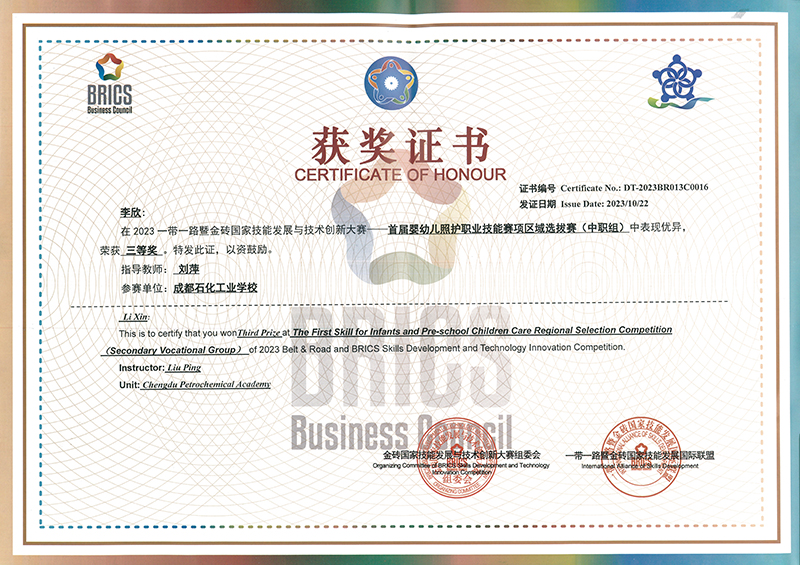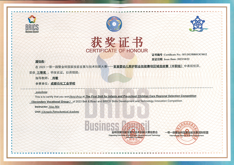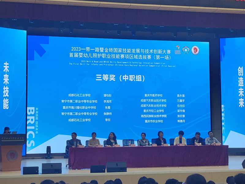 10月22日,在重庆城市管理职业学院举行的2023年一带一路暨金砖国家技能发展与技术创新大赛之首届婴幼儿照护职业技能赛项区域选拔赛中,成都石化工业学校幼儿保育专业学生潘怡彤、李欣(指导教师:刘萍、肖敏)荣获三等奖。