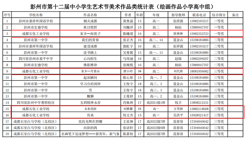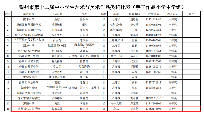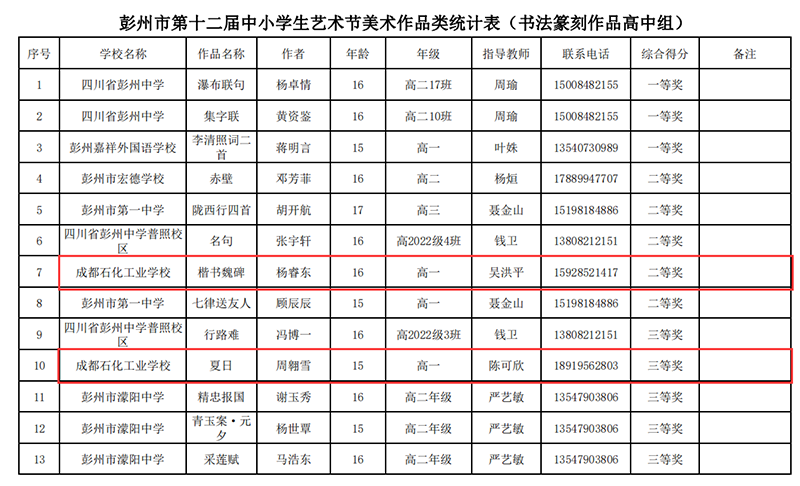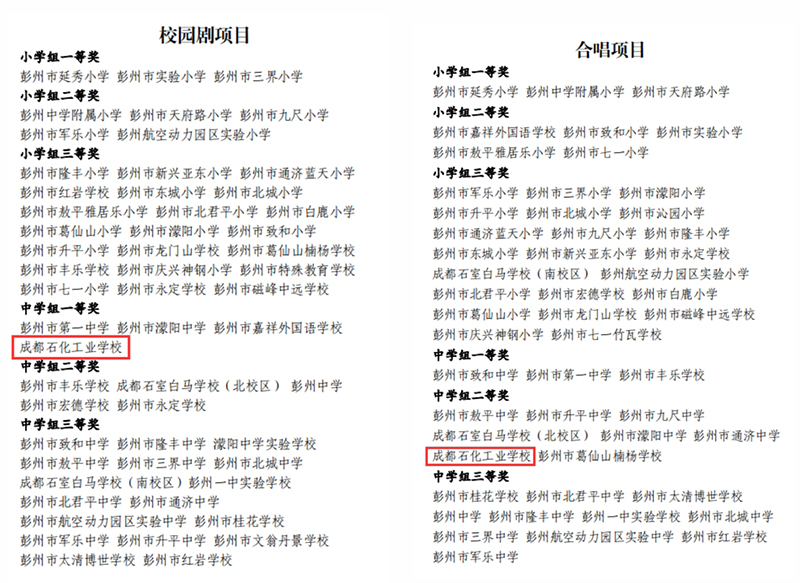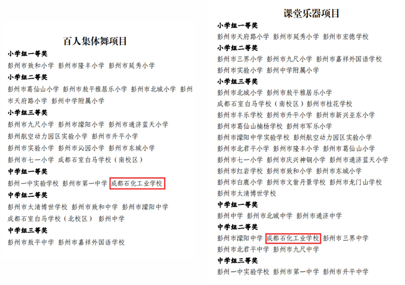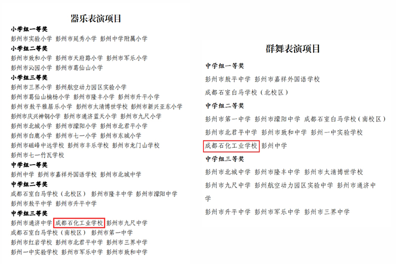 汗水和泪水终有回报,荣誉属于努力和拼搏。中小学生艺术节和“牡丹杯”校园篮球联赛是全面加强和改进新时代学校艺体工作,推动中小学艺体教育发展,培养高水平学生艺体人才和队伍的重要平台。成都石化工业学校积极参加彭州市教育局每年举办的艺体活动,在此,特向全体获奖学生表示热烈祝贺,向全校师生、家长、各位朋友报喜!现将获奖学生名单公示如下: