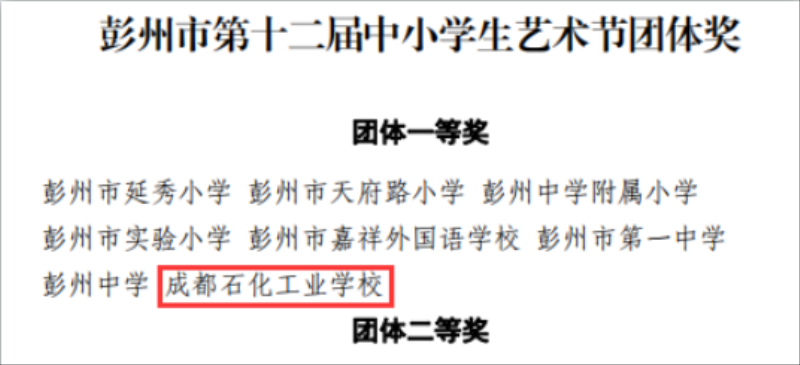 春耕种,秋收绩,一点一滴勤积累,辛勤耕耘结硕果。成都石化工业学校全面贯彻落实立德树人根本任务,聚焦“双特”建设,关注学生全面发展,提升学生综合素养,近日,在彭州市第十二届中小学艺术节活动、彭州市“牡丹杯”校园篮球联赛等活动中捷报频传,全面展示了学校优秀的艺体发展成果。