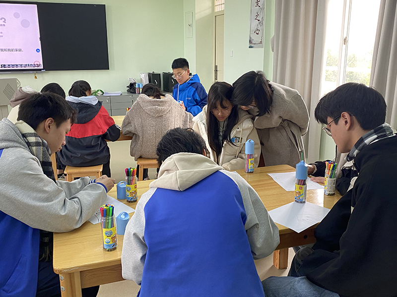 北校区的团体交流活动邀请到中国陶行知研究会家庭教育专业委员会特邀讲师、成都市优秀班主任李春容老师与本校心理健康教育刘宇老师共同担任活动导师。活动伊始,学生们通过分享“我的自画像”,从生理、社会、精神等多个角度来描绘自己。这不仅让同学们更深入地理解了自我,也让他们学会了从多维度看待自己。正如活动导师所言:“了解自己,是自我认知的第一步。”接着,学生们在绘画“我和我的家庭”中,进一步探索自己的内心世界。他们用画笔描绘出自己与家人的关系,同时反思这些关系如何影响自我认知。通过这个环节,学生们更加深刻地认识到,自我认知的多维度性。随后,学生们进行了关于对自己的满意度讨论。在导师的积极引导下,他们勇敢地分享了自己的优缺点,对自己进行一次全面的剖析。这次交流不仅让同学们更加了解自己,更重要的是让他们学会如何更加地接纳自己。