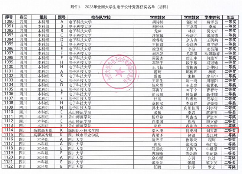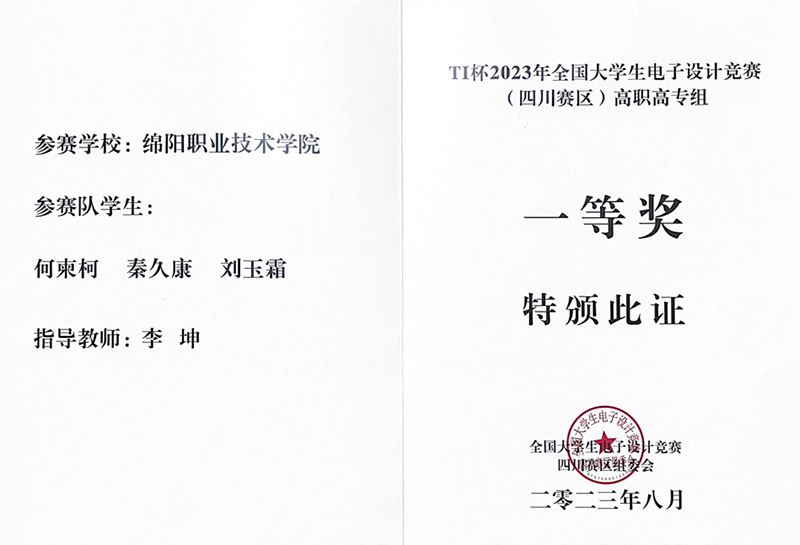 近日,2023年全国大学生电子设计竞赛获奖名单公布,我校优秀毕业生2022届电子技术应用一班何柬柯,代表绵阳职业技术学院与一千所高校的1.6万支参赛队的5万参赛学生同场竞技,先后荣获四川省一等奖和全国二等奖。