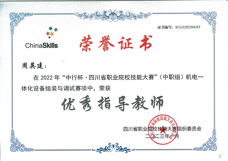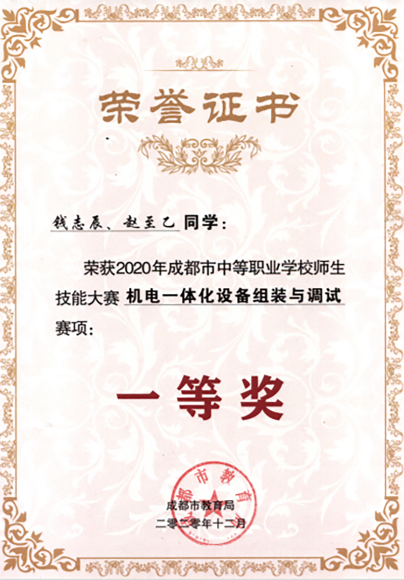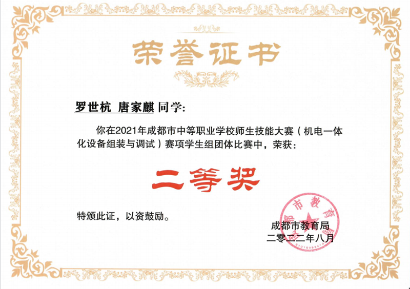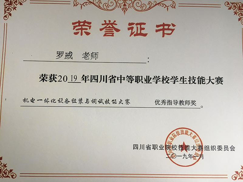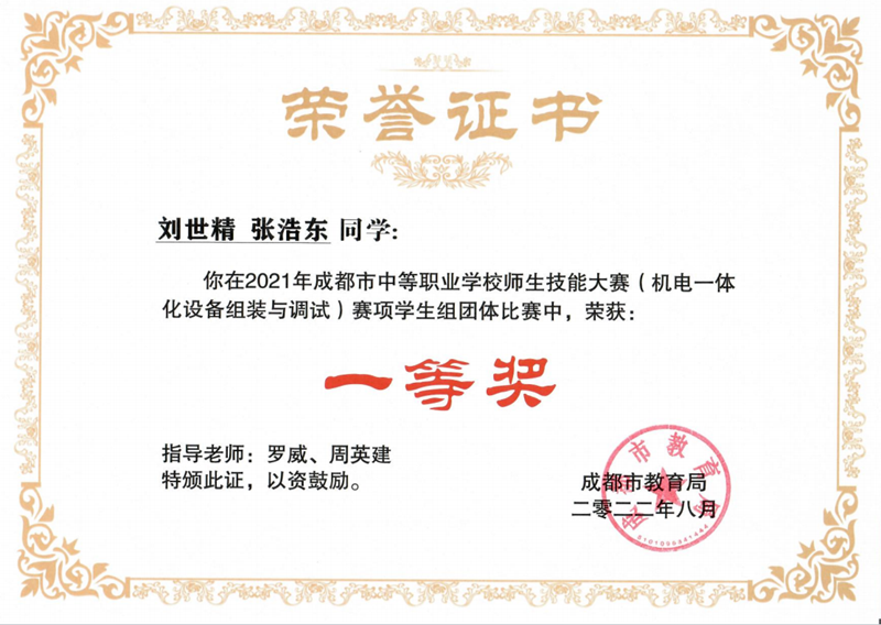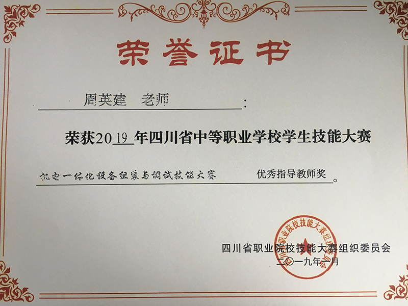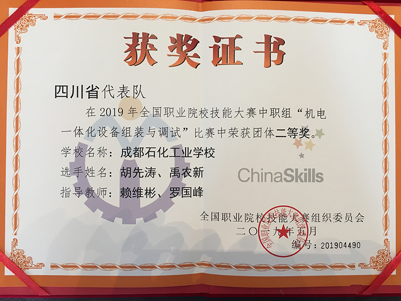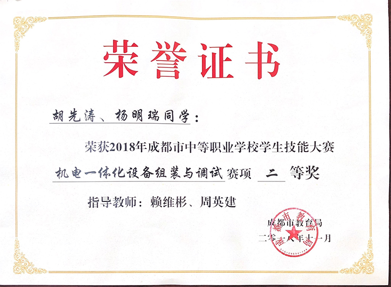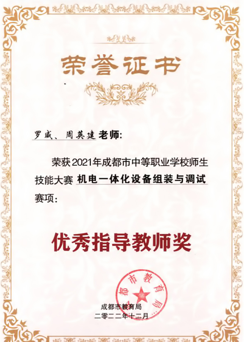 通用机电设备安装与调试赛项,2018年首次参加该赛项比赛至今,先后荣获全国二等奖1个,三等奖1个;四川省一等奖4个,二等奖1个;成都市一等奖3个,二等奖5个。周英建老师和罗威老师先后被评为四川省优秀指导教师4次,成都市优秀指导教师3次。