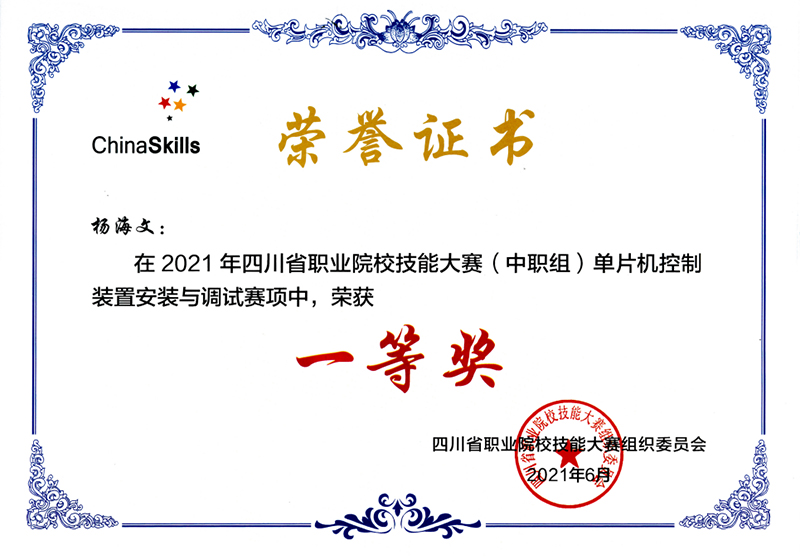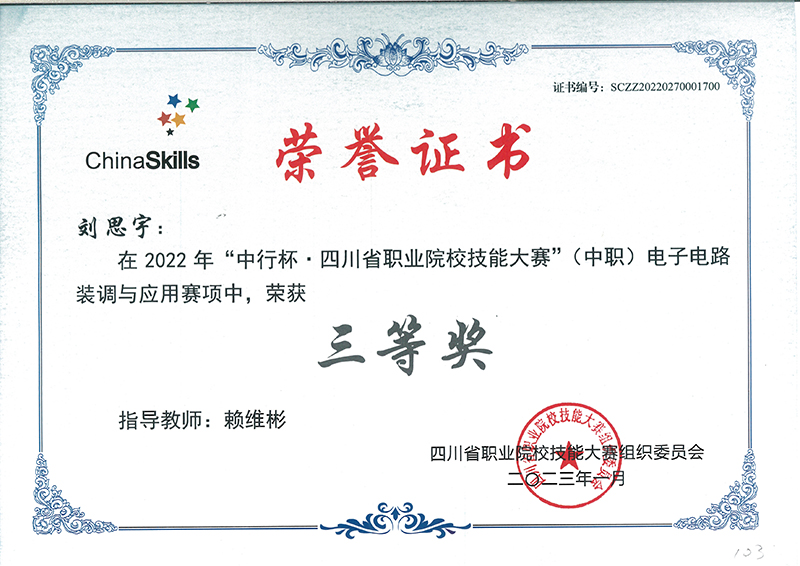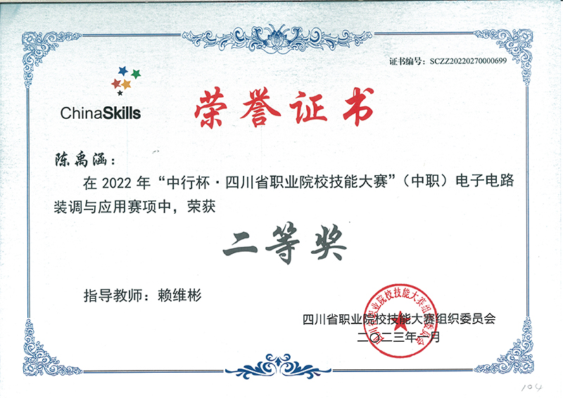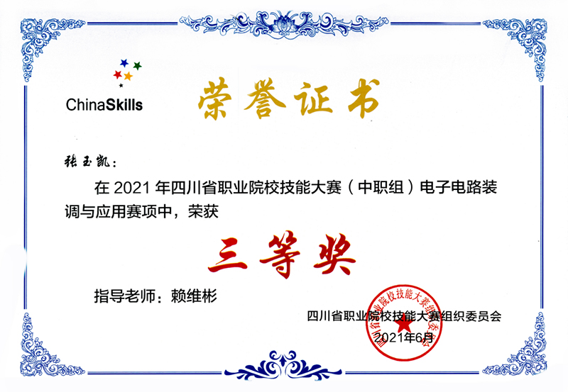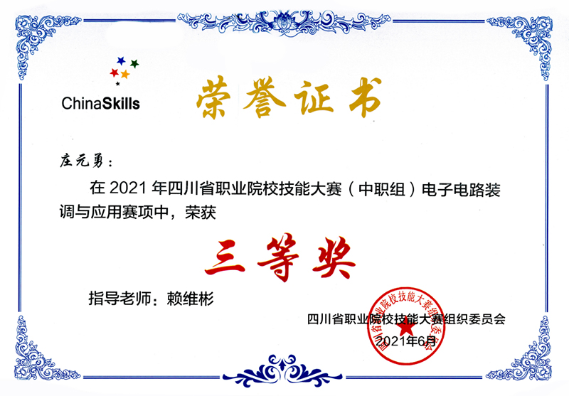 电子产品设计与应用赛项,2021年首次参加该赛项比赛至今,先后荣获四川省一等奖1个,二等奖2个,三等奖3个。赖维彬老师被评为优秀指导教师。