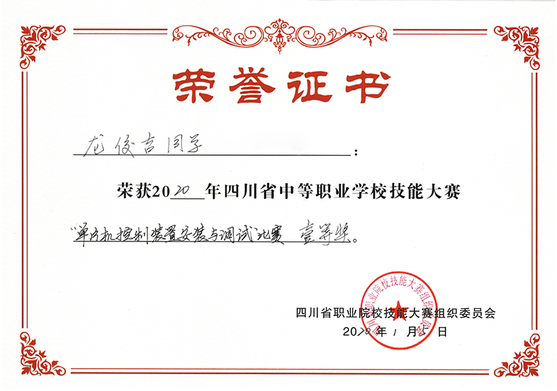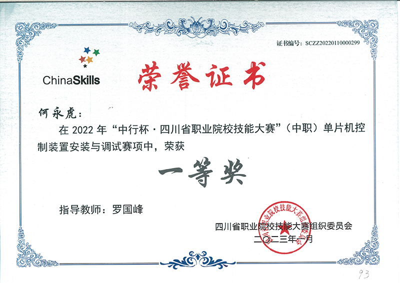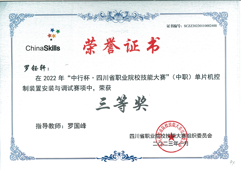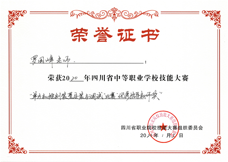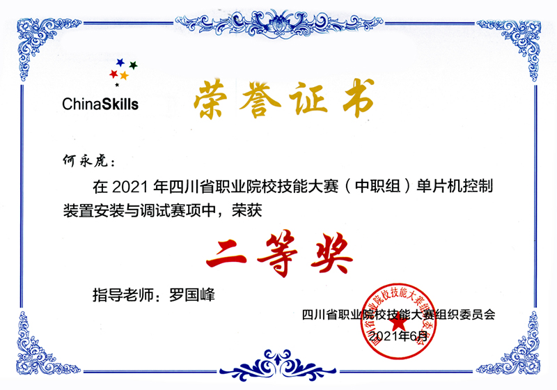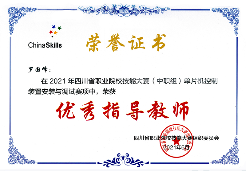 单片机控制装置安装与调试赛项,2020年首次参加该赛项比赛至今,连续四年荣获四川省一等奖,同时还荣获四川省二等奖1个,三等奖2个。罗国峰老师连续4年被评为四川省优秀指导教师。