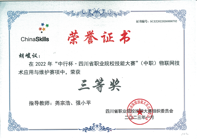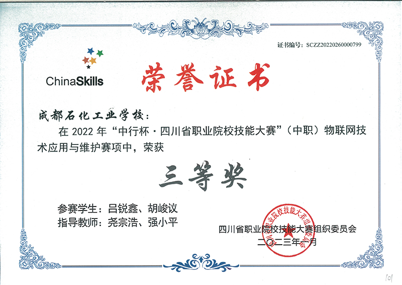 物联网技术应用赛项,2022年首次参加该赛项比赛至今,先后荣获四川省二等奖1个,三等奖1个。