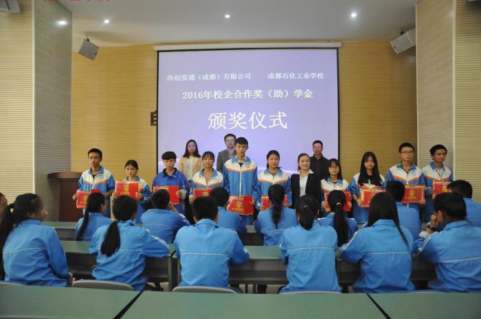 10月18日下午,成都石化工业学校在南校区多功能厅成功举行2016年纬创校企合作奖学金发放仪式。出席本次仪式的有纬创资通(成都)有限公司人事部主管赵春梅、成都石化工业学校副校长周川益、教务处副主任马洪敏。会议由学校招生就业处副主任龙学美主持。