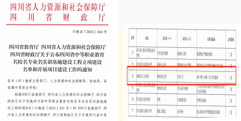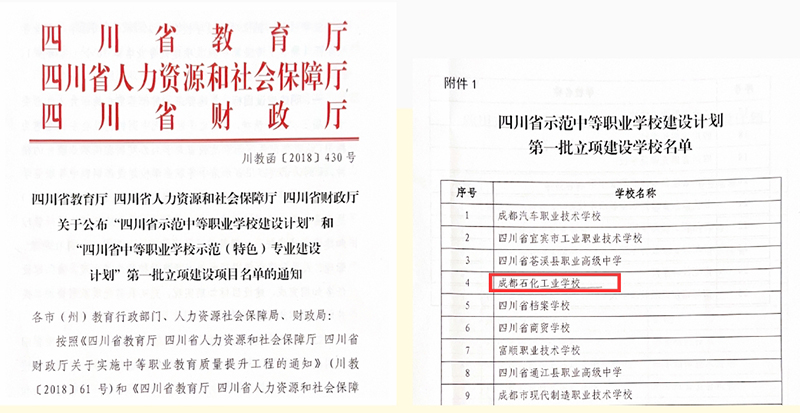 2018年,四川省教育厅、四川省人力资源和社会保障厅、四川省财政厅关于公布《“四川省示范中等职业学校建设计划”和“四川省中等职业学校示范(特色)专业建设计划”第一批立项建设项目名单的通知》,《通知》指出:“双示范”建设计划是我省中等职业教育改革发展的重要举措,各地要充分履行管理和建设主体责任,加大对项目学校的支持力度,充实我省优质职教资源,提升中职办学水平和质量,我校入围第一批立项建设学校。