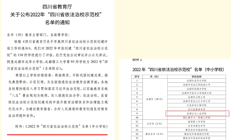 9.2022年,我校荣获“四川省依法治校示范校”光荣称号,持续提升我校治理体系和治理能力现代化水平。