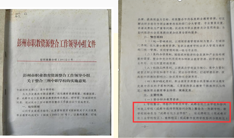 1.2013年,彭州市职业中学、成都石化工业学校和彭州市技工学校(成都市技师学院彭州分院)成功整合为一所新学校,新学校命名为“成都石化工业学校(彭州市技工学校)”。