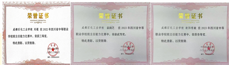 8.2022年、2023年,我校教师刘银、袁润芝、欧阳程敏,连续在“四川省中等职业学校班主任能力比赛”中获奖,刷新我校在该赛项的历史成绩,在省级班主任能力比赛中全面展示我校班主任队伍专业素养和建设水平。