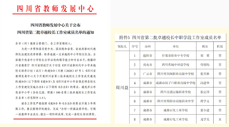 2022年12月22日,根据四川省教育厅 四川省财政厅关于印发《四川省新时代中小学卓越校长培养计划(试行)的通知》(川教[2020]47 号)、《四川省教师发展中心关于开展四川省第二批卓越校长工作室成员遴选的通知》(以下简称《通知》)及《四川省中小学省级名师名校长 工作室建设实施办法》(以下简称《办法》)的要求,我校党委书记周川益牵头成立的卓越校长工作室被批准为四川省第二批卓越校长工作室。这是学校第一个省级工作室,彰显了我校办学治校的领导能力和专业水平。