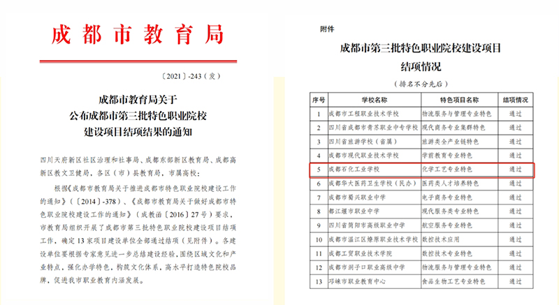 2021年10月,四川省教育厅、四川省人力资源和社会保障厅、四川省财政厅关于公布《四川省中等职业教育名校名专业名实训基地建设工程立项建设名单和开展建设工作的通知》,《通知》指出:坚持质量为先、标准引领、改革导向,支持办学定位准确、 基础条件良好、办学优势明显、专业特色鲜明、发展潜力较强、地方政府或学校举办者支持力度大的学校,我校成功入围“三名工程”三星建设学校。
