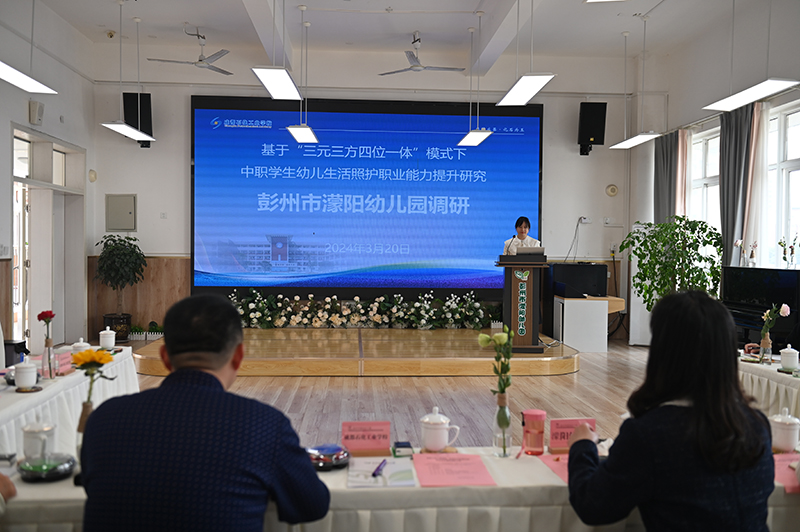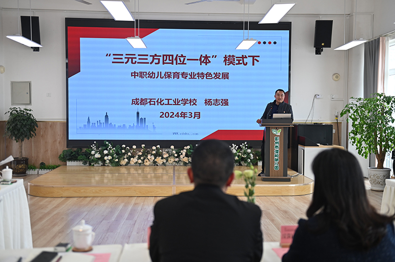濛阳幼儿园对成都石化工业学校的到来表示热烈欢迎,并带领大家参观了幼儿园户外环境、观摩了幼儿的区角游戏,在濛阳幼儿园杨胜兰园长的介绍下,详细了解了幼儿园的基本情况、教育理念和教育特色;成都石化工业学校教务处主任、学前信息科科长、幼儿保育专业负责人杨志强做了题为《“三元三方四位一体”模式下中职幼儿园保育专业特色发展》的专题分享,开展了人才培养、岗位需求、教学资源建设等相关调研。最后,园校双方举行了授牌仪式,并就校企合作的具体方式和如何提升在校学生和新入职教师的幼儿照护技能提升等问题进行了深入研讨。